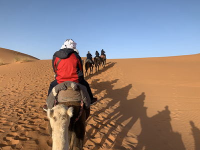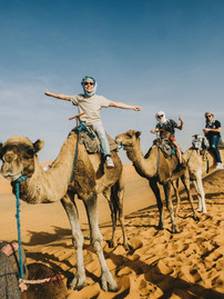 Finally, the moment we were all waiting for, the Sahara desert! Seeing the wide expanse of orange sand dunes as we approached the edge of the desert was something I probably would keep in my mind for a long time to come. Coming closer to the camels, we realised that they were connected to one another so as to make sure they do not go rouge and run away with you into the vast desert. However, they were treated pretty well. Also, you will be surprised how high up you actually are on the camels, and it is definitely not the most comfortable ride, especially for guys, if you know what I mean ;).